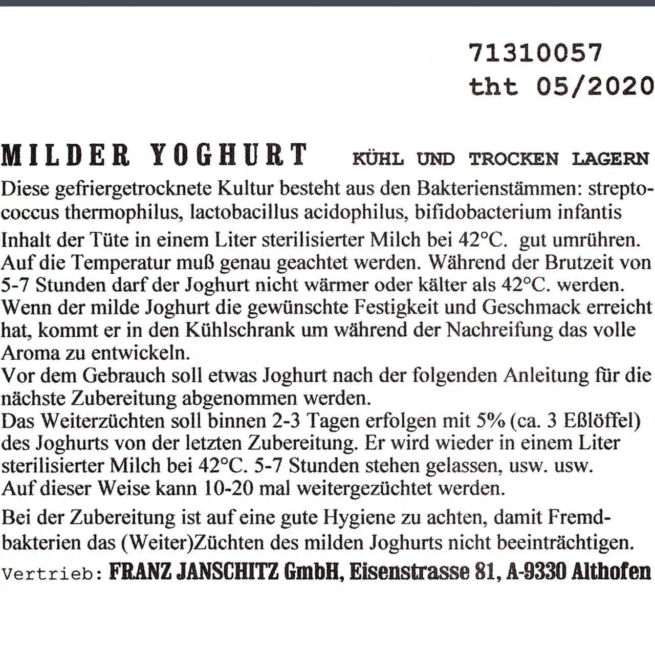 Mix well in one liter of sterilized milk and ensure the temperature is at 42°C. During the incubation time of 5-7 hours, the temperature must not fall below 41°C or exceed 42°C. Once the desired consistency and taste are achieved, place the yogurt in the refrigerator to develop its full aroma during the maturation process.