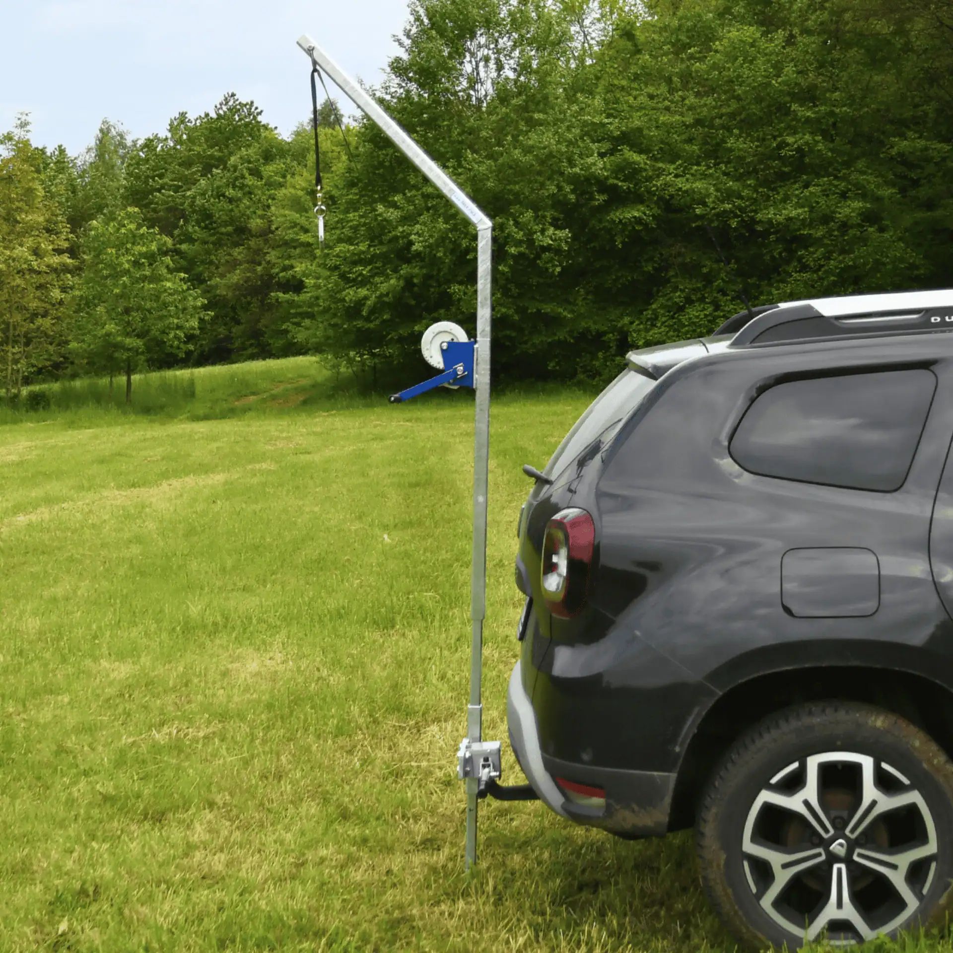 The assembly is straightforward and tool-free, taking less than a minute. The Wild Gallows "Diana" can be used without a rear carrier and can be mounted either with a quick release on the tow hitch or via a bracket embedded in the ground. Whether in the field or at the processing site, you'll always be well-equipped. Its three-part design allows for easy transport of individual components, while torsional rigidity is additionally ensured on soft ground. Ideal for the upcoming driven hunts!