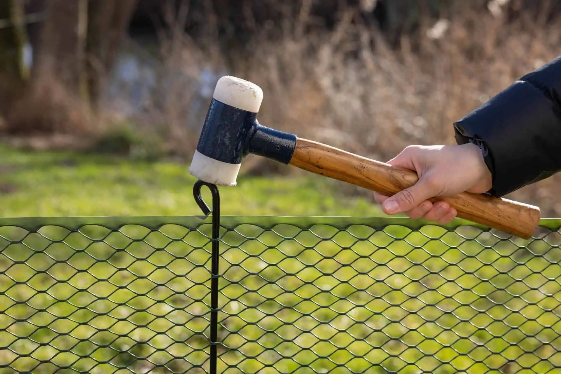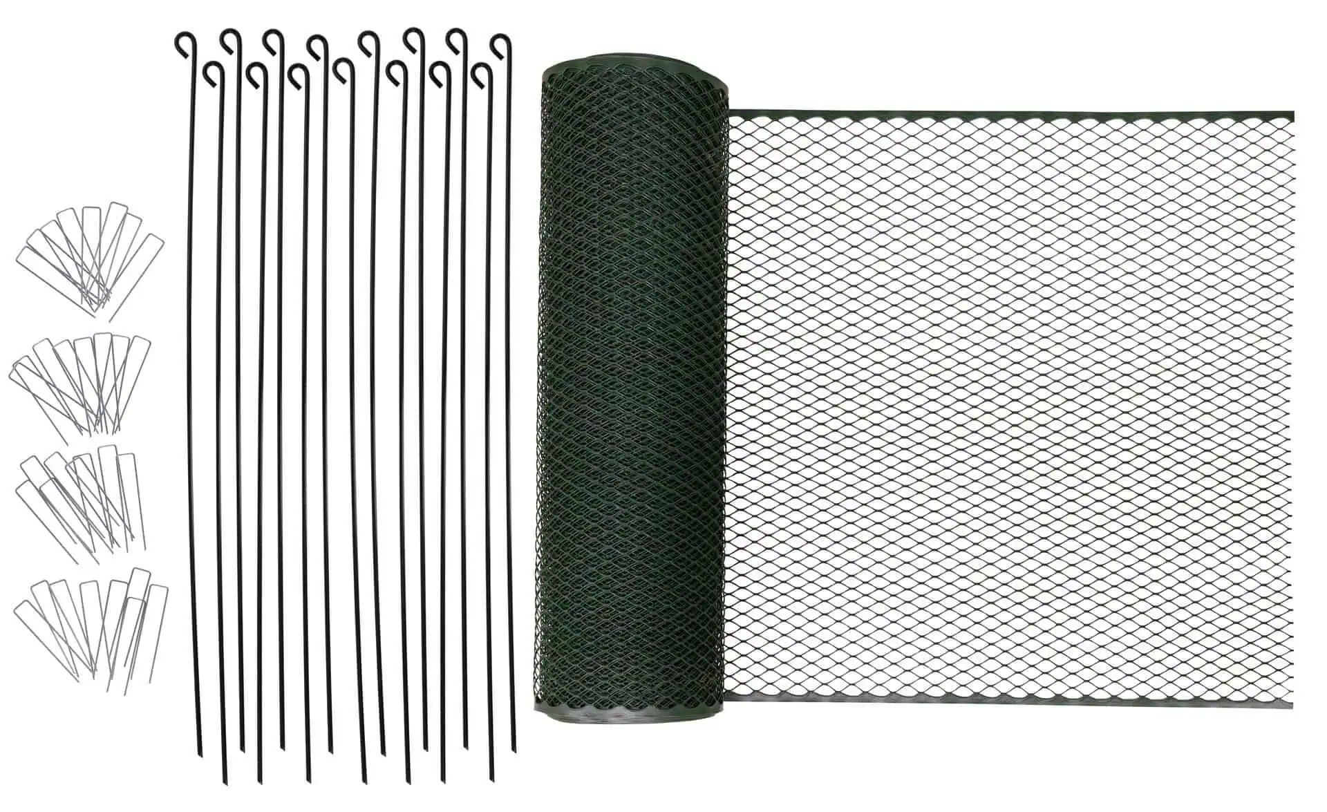 - Robust plastic fence with sturdy galvanized metal fastening posts, including ground anchors for secure attachment to the ground