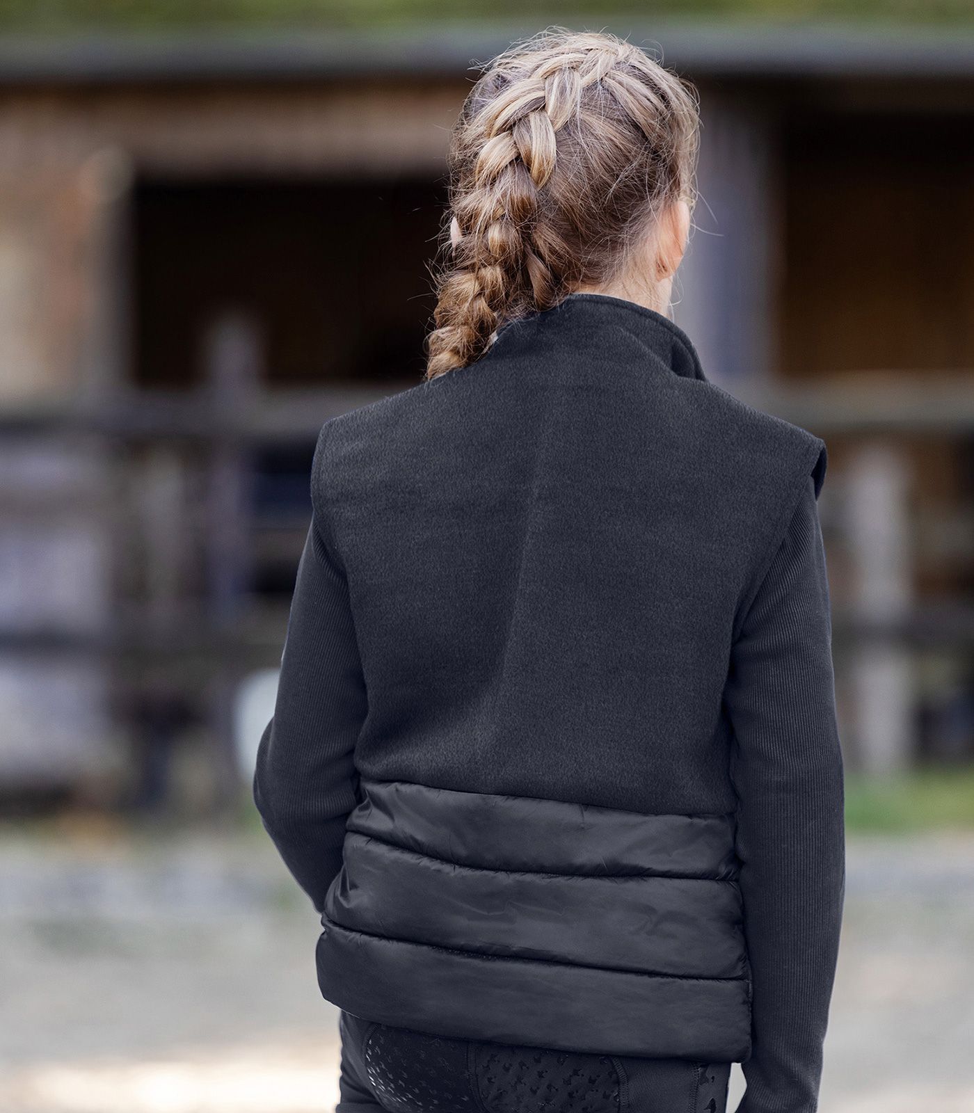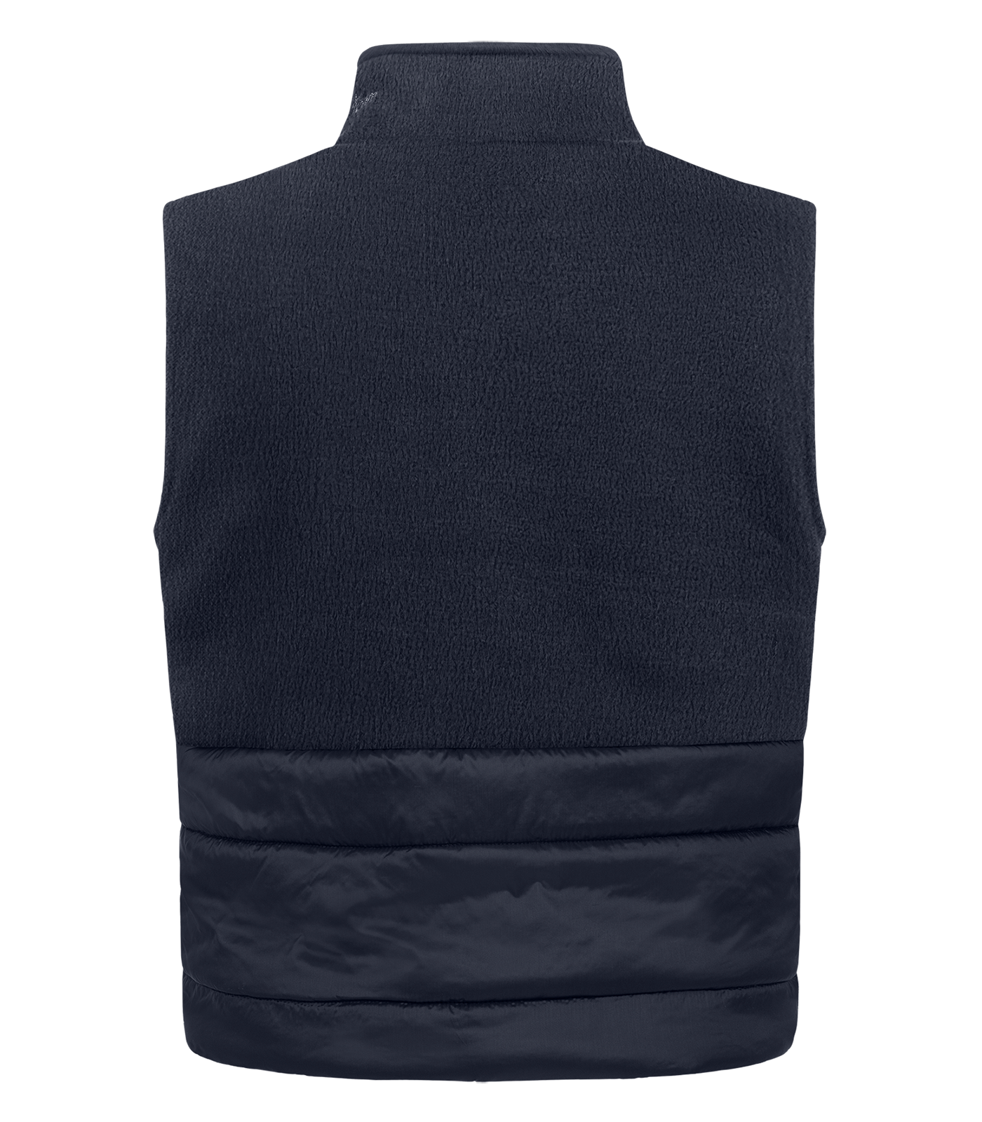 The quilted vest consists of a material mix. The upper section (front and back, collar, and sleeves) is made of cozy fleece. The lower section (front and back, as well as the front placket) is quilted.