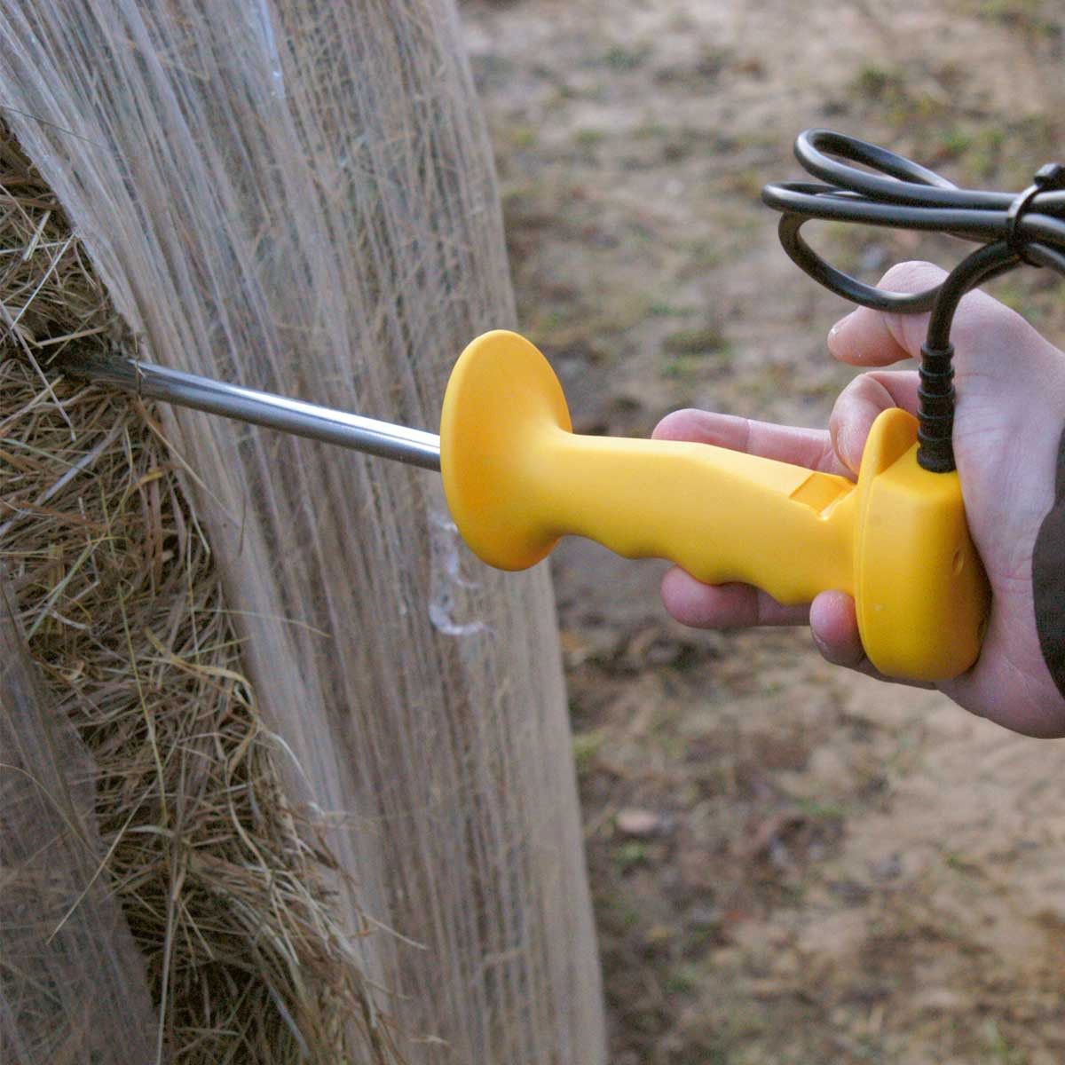 - egy 55 cm hosszú szondát tartalmaz, amely regisztrálja a széna és a szalma elektromos vezetőképességének változásait, és azokat nedvességszázalékokká alakítja át.