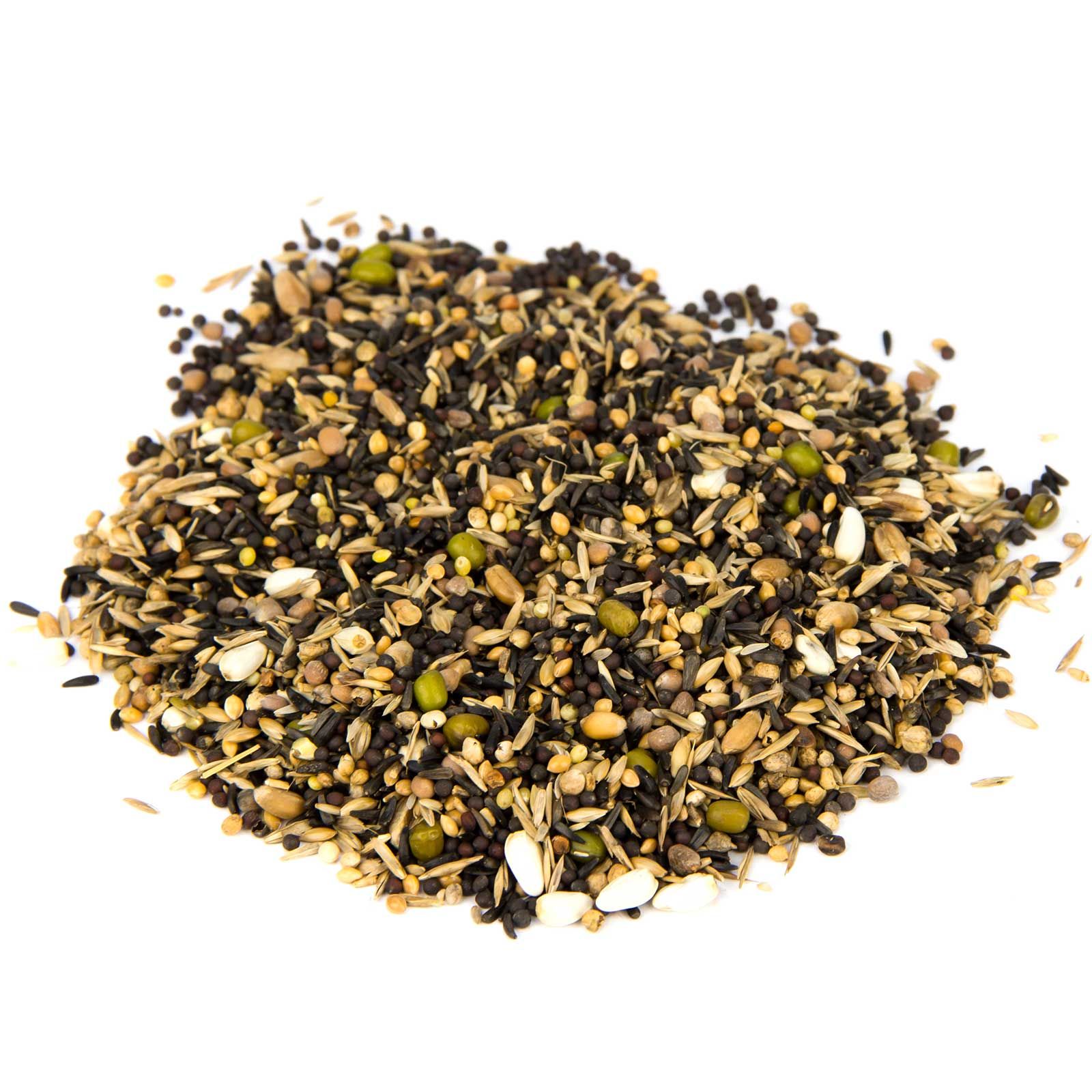 27 % négermag, 20 % tavaszi repce, 2 % fehér salátamag, 4 % fűmag, 10 % sárga köles, 5 % búza, 5 % mungóbab, 6 % spenótmag, 7 % retekmag, 5 % cikóriamag, 3 % kardvirágmag, 6 % fényes mag