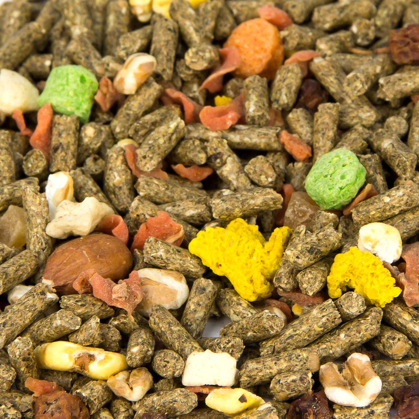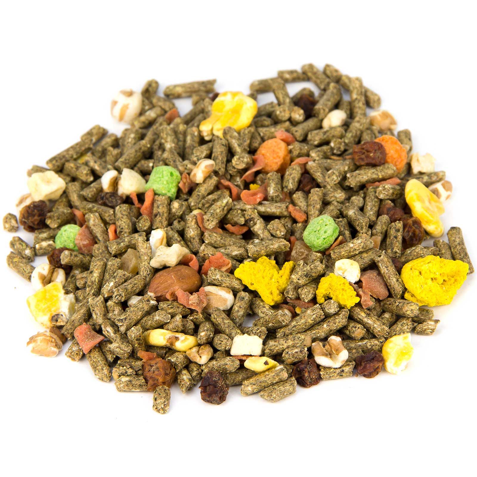 Lucerna zöldliszt, búzakorpa, árpa, búza, kukorica, szója (bab) extrakciós liszt (gőzzel melegítve), lignocellulóz, repce extrakciós liszt állománytal, lucerna széna, sárgarépakocka, pattogatott kukorica, Pattogatott búza, kalcium-karbonát, cukorrépa-melasz, zöld kukoricakása, vörös kukoricakása, sárga kukoricakása, monokalcium-foszfát, banánchipsz, "Red Skin" földimogyoró, csipkebogyó, magnézium-oxid, nátrium-klorid