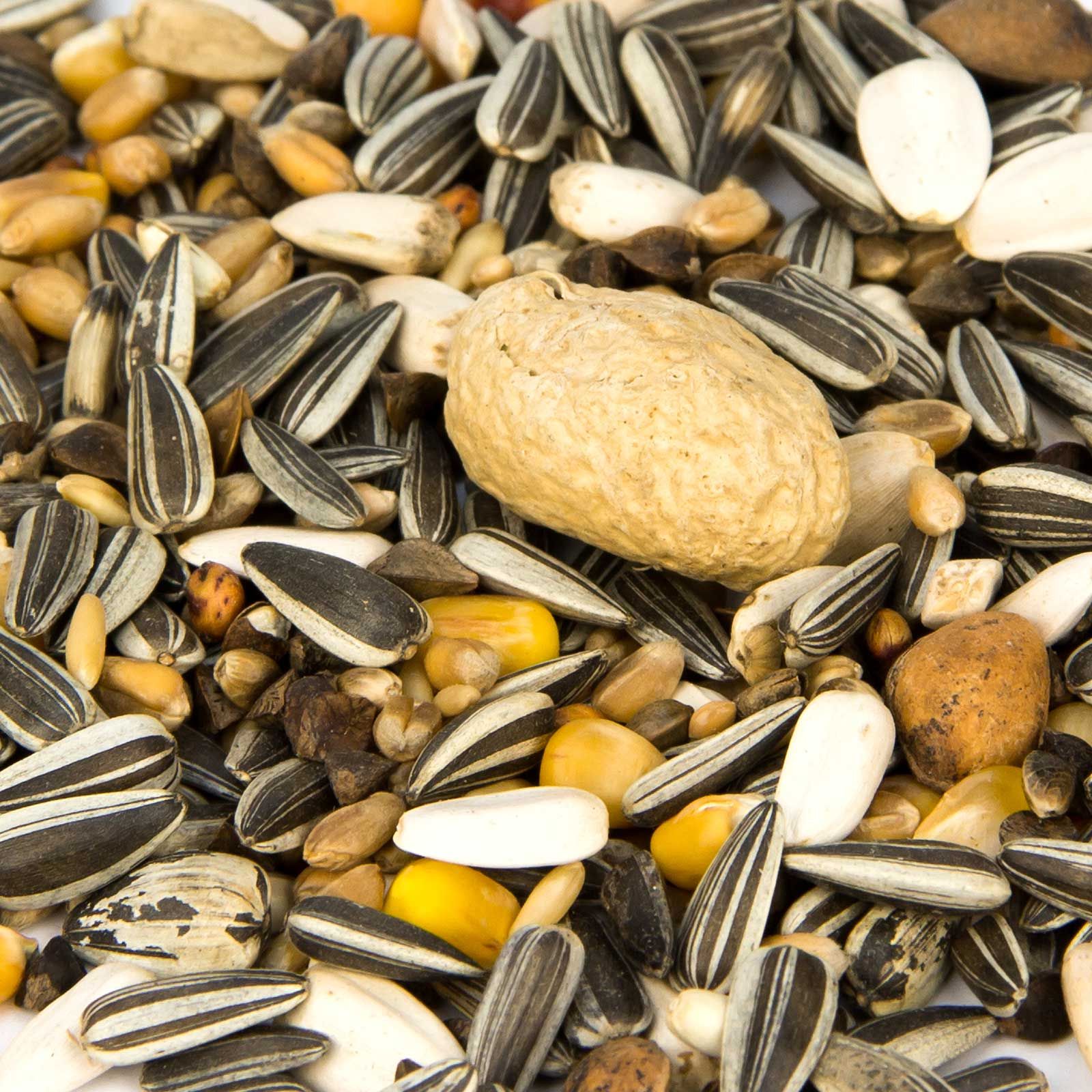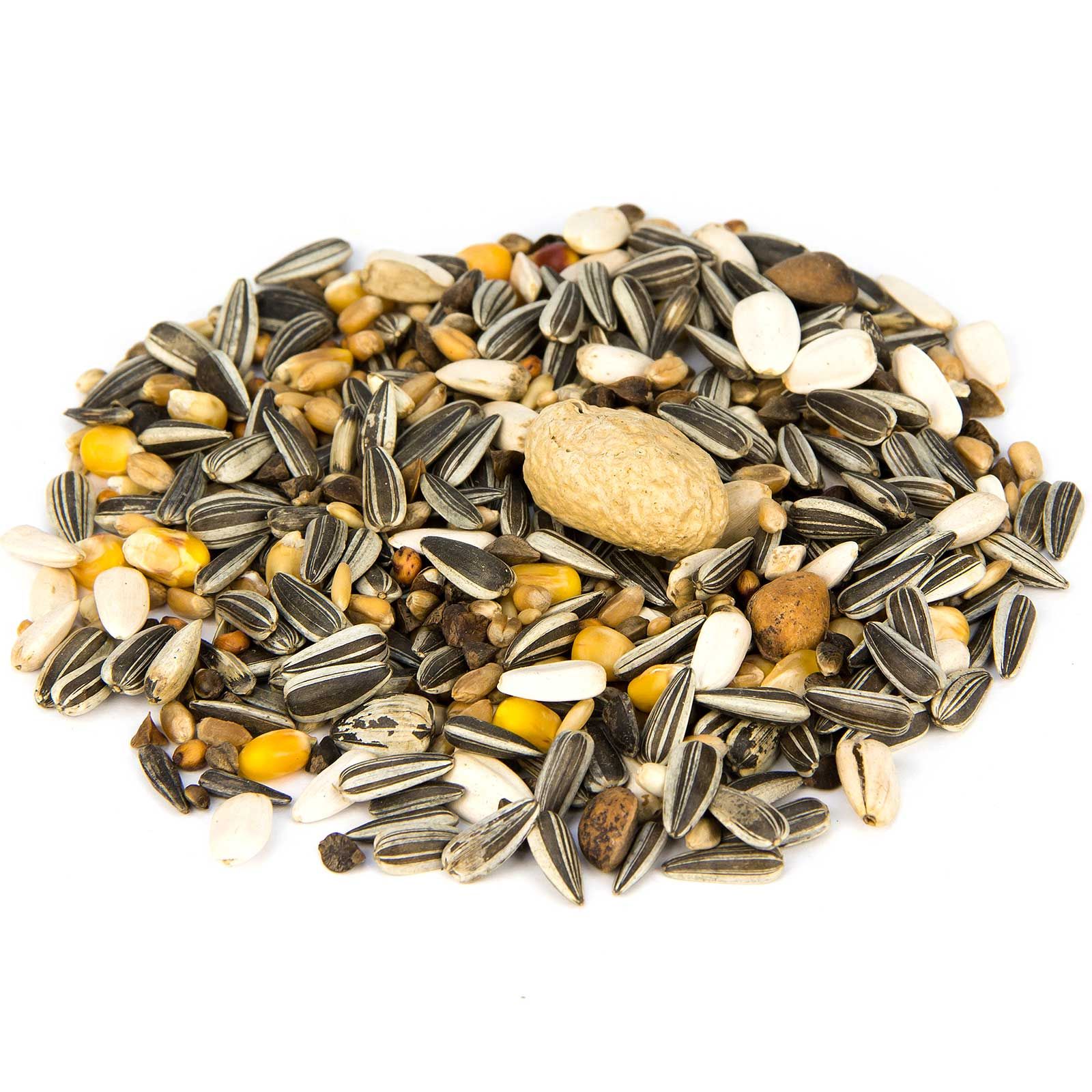 42 % napraforgó csíkos, 15 % búza, 11 % kukorica, 7 % hajdina, 8 % napraforgó fehér, 5 % zabpehely, 3 % kender, 3 % milokorn, 2 % földimogyoró, 2 % fenyőmag, 2 % kardiómag.
