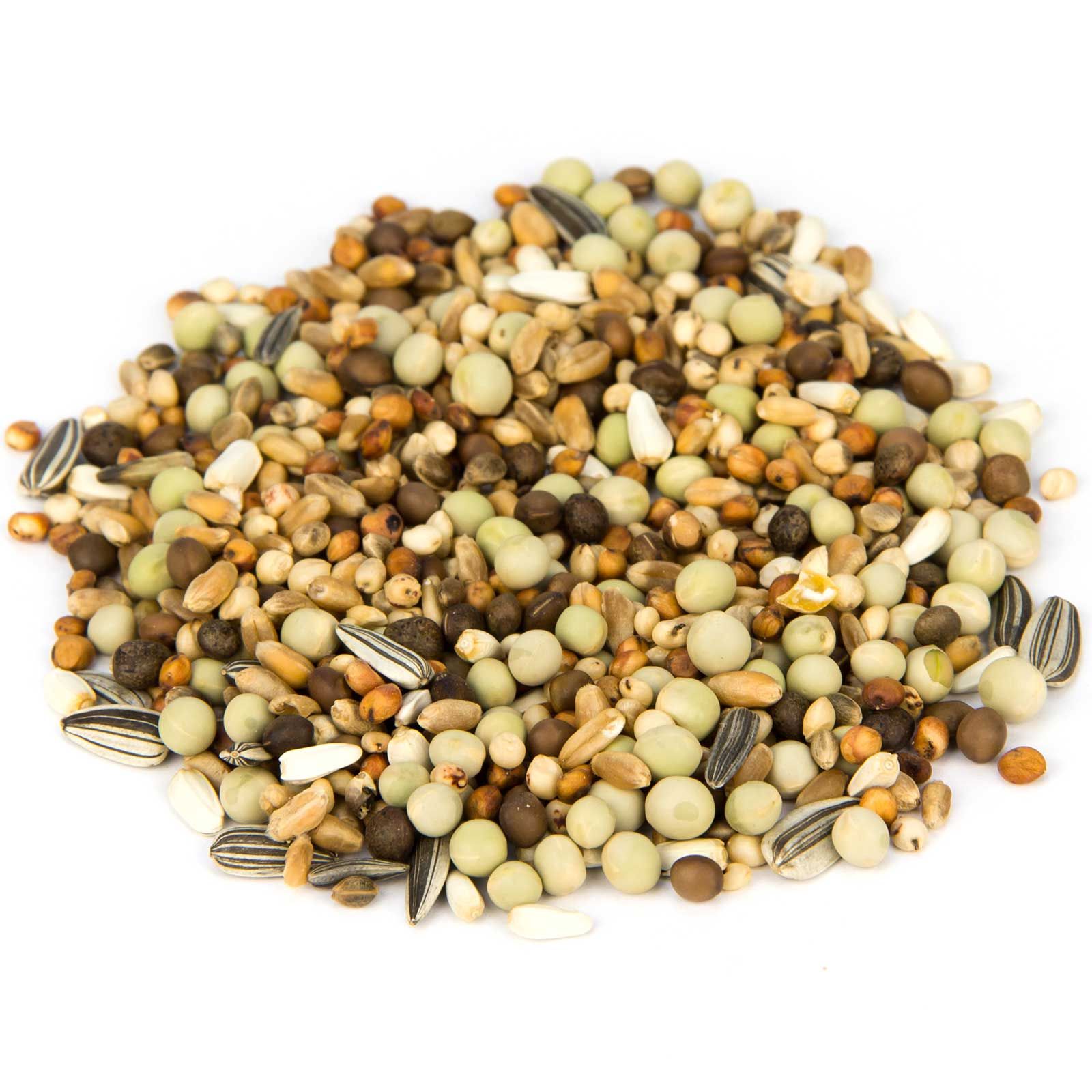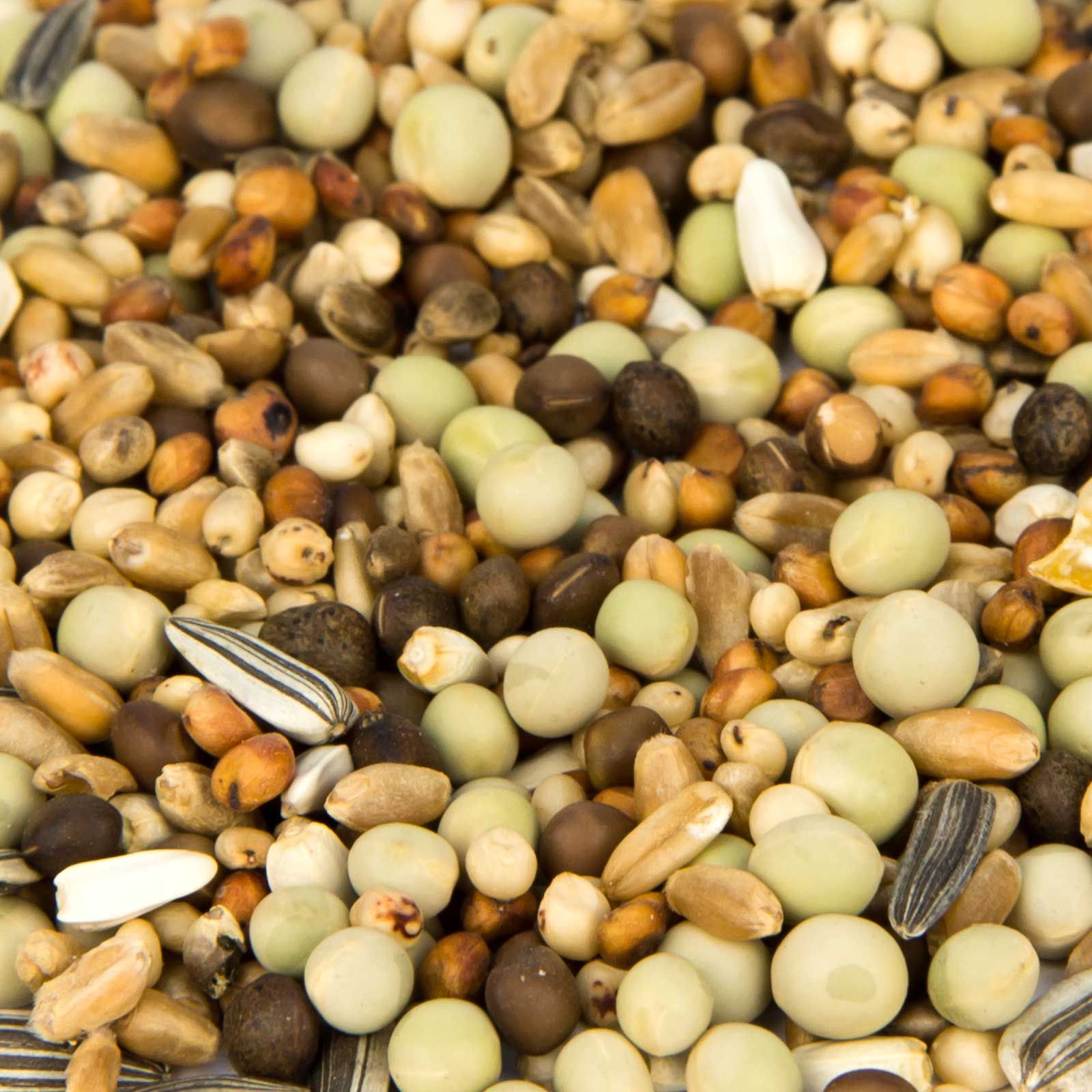 23 % kisborsó, 17 % búza, 16 % bükköny, 14 % milokorn, 13 % dari, 6 % sáfrányvirág-mag, 4 % napraforgómag, 4 % kender, 3 % zabpehely.