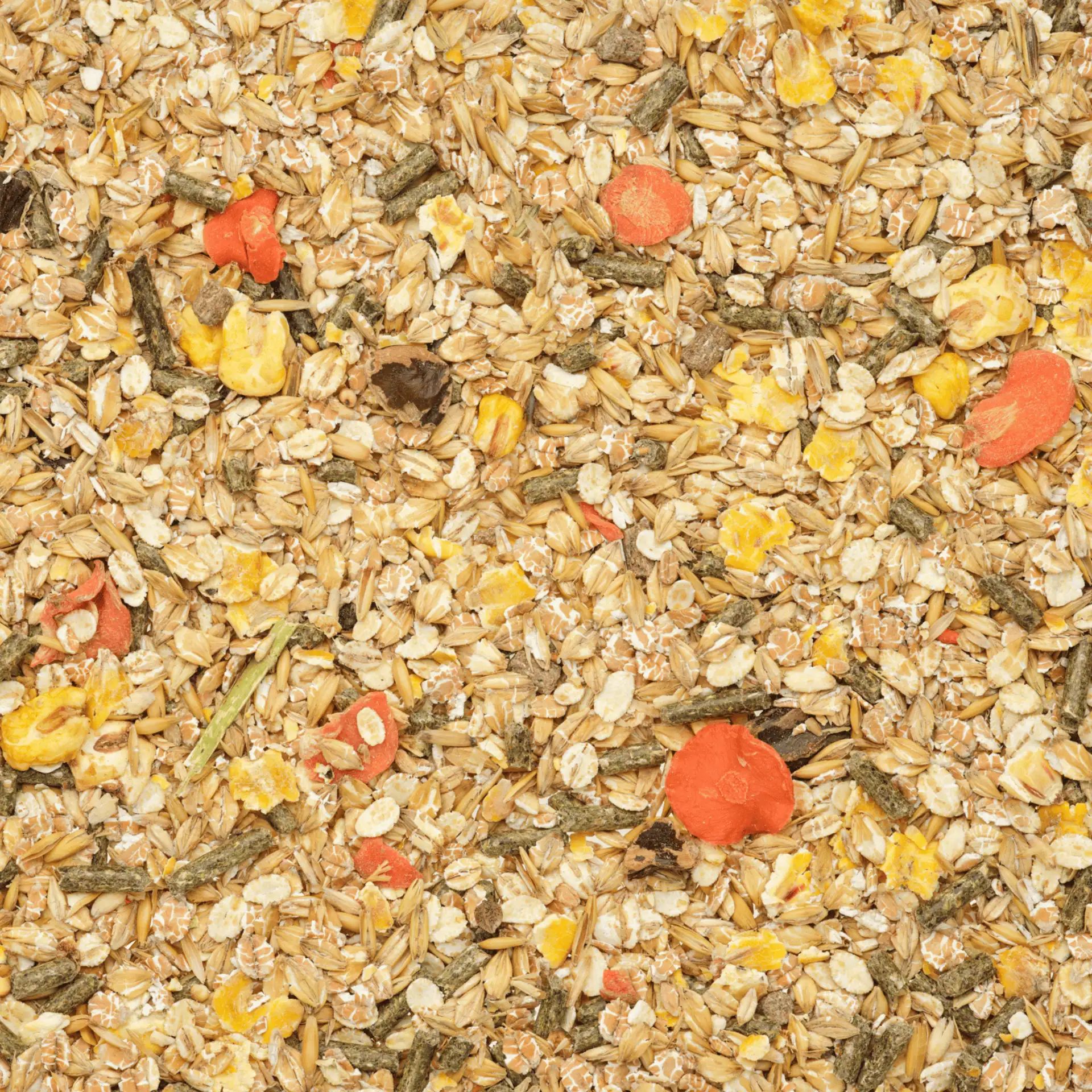 Zúzott árpa, zúzott zab, búzapehely, kukoricapehely, lucernazöldliszt, alma pép, búzacsíra, árpa, búza, kukorica, gőzölt szójaolaj-kivonat (QS-Soja plus), szeletelt karob, lignocellulóz, repceolaj-kivonat takarmány, kalcium-karbonát, lucernaszéna, répa kockák, cukorrépa melasz, nátrium-klorid, monokalcium-foszfát, napraforgóolaj, magnézium-oxid, repceszós, lenolaj-kivonat takarmány, búzaliszt.