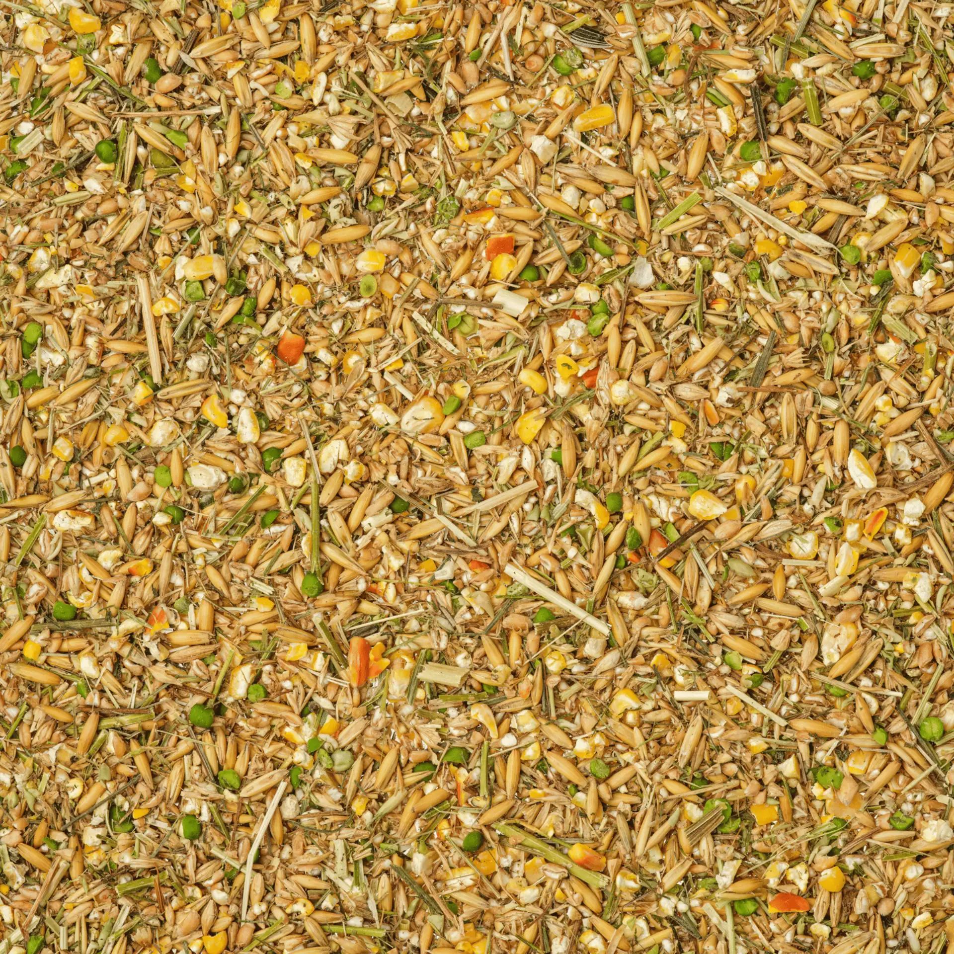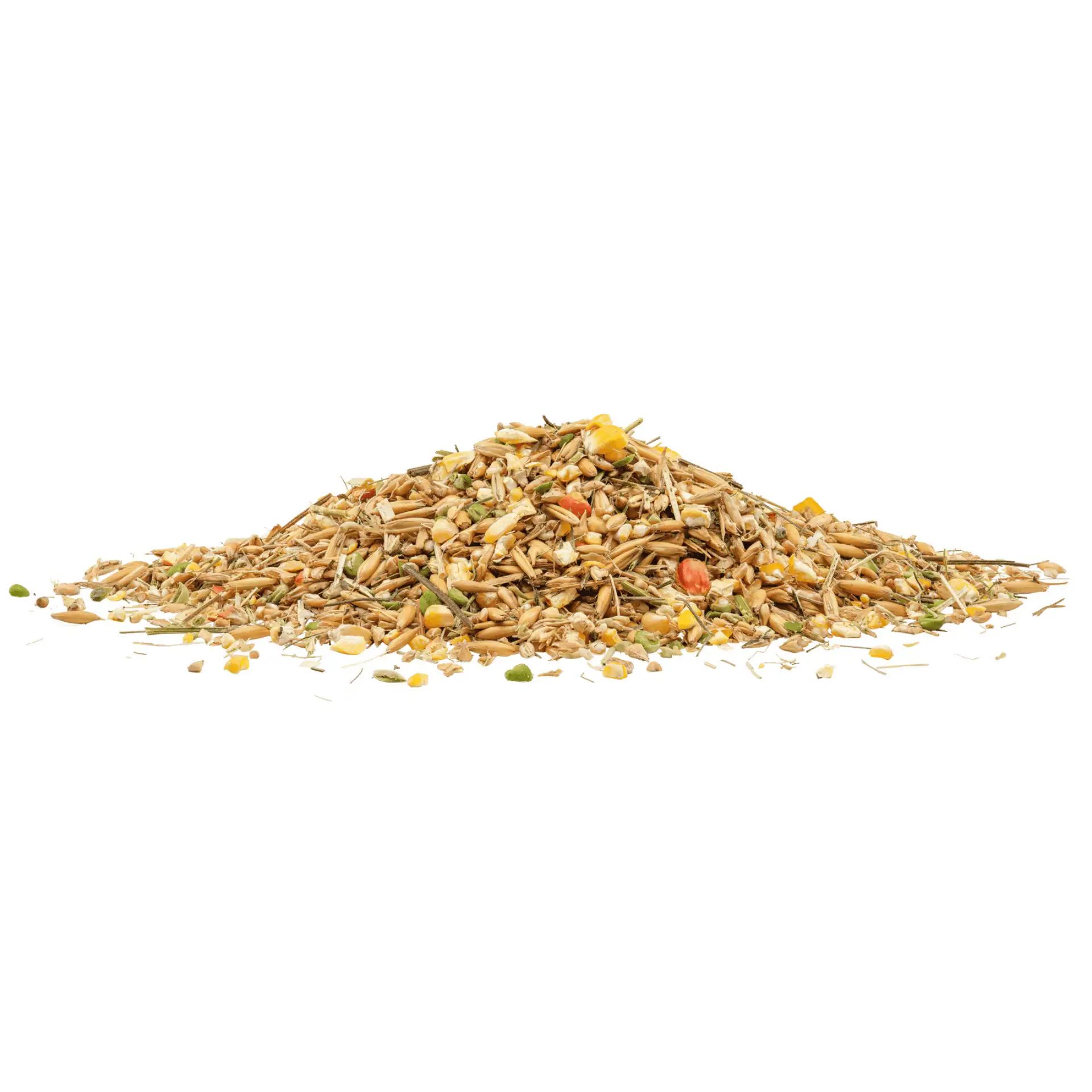 Ez a kiváló minőségű természetes müzli a juhok, bárányok és kecskék fajoknak megfelelő kiegészítő takarmánya. A kiegyensúlyozott takarmánykeverék csak a legjobb összetevőket tartalmazza, mint például zabot, borsót, európai szójalisztet és - különleges fehérjeforrásként - levegőn szárított lucerna szénát. Az aprított széna hatékonyan serkenti a kérődzők nyáltermelését, és így biztosítja a takarmány jobb emésztését és hasznosulását.