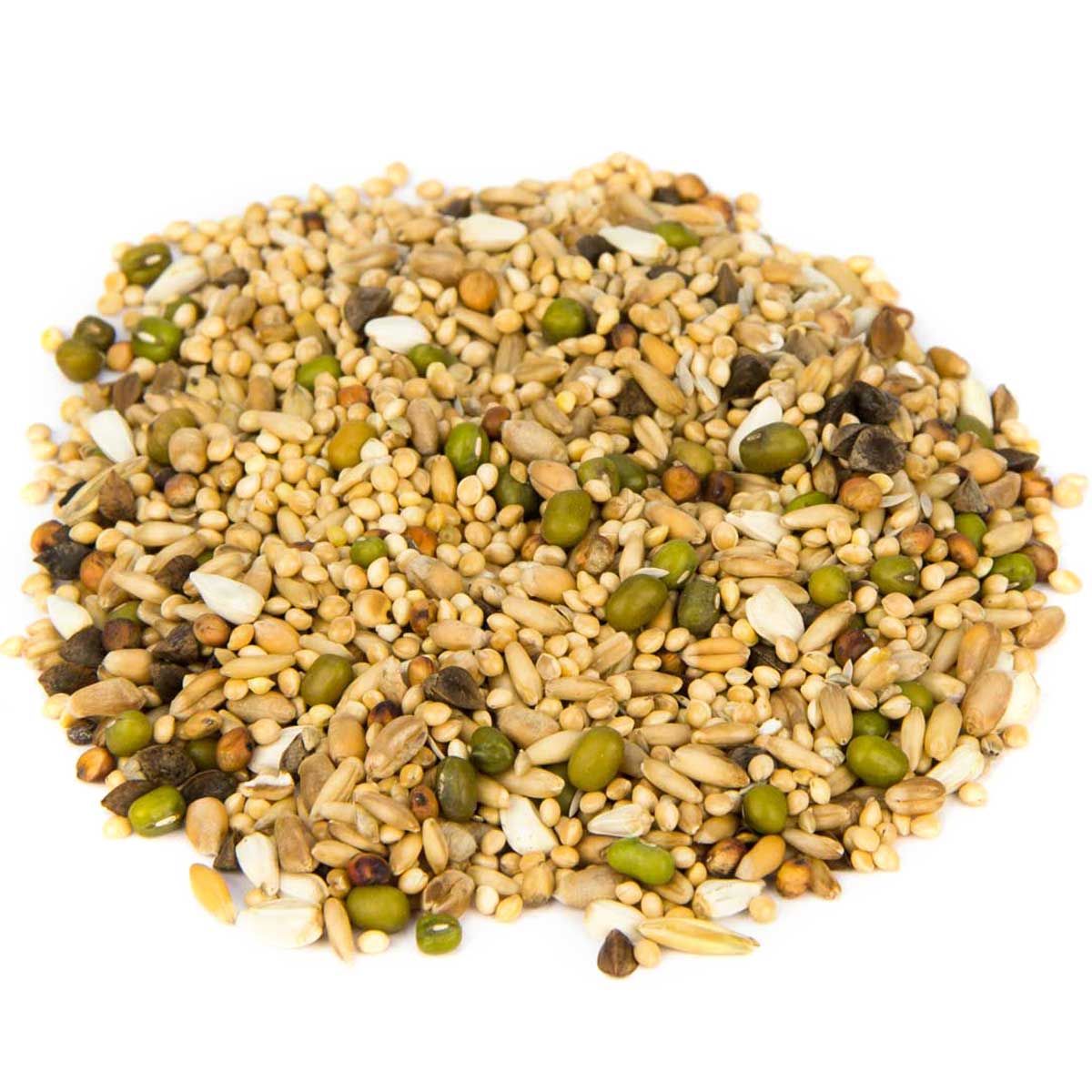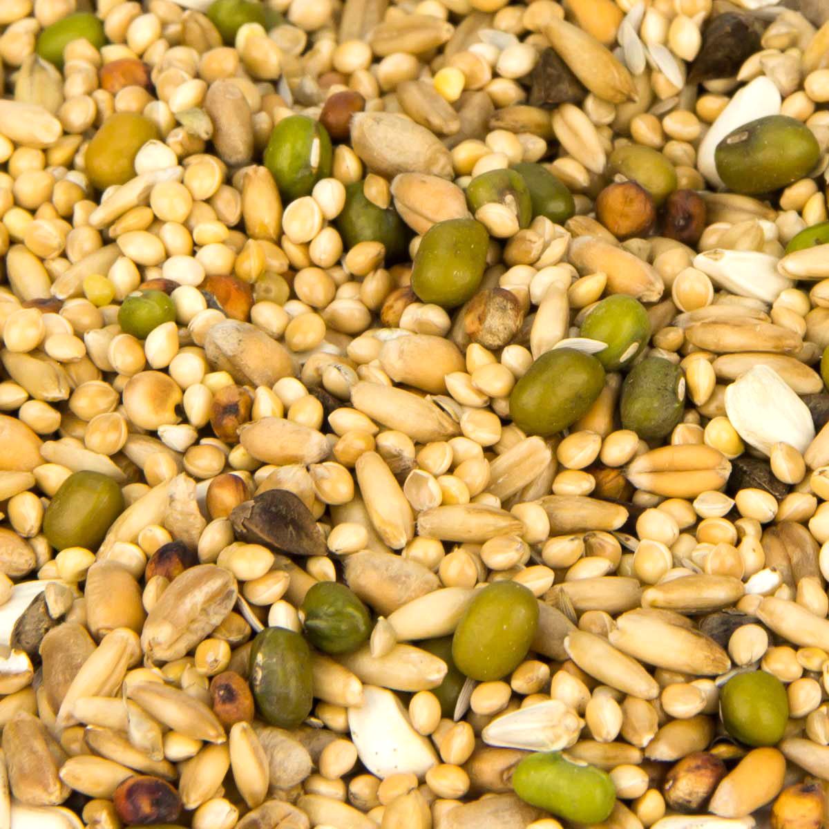 45 % sárga köles, 14 % búza, 14 % zab, 8 % mungóbab, 4 % milokorn, 6 % fehér köles, 3 % cardi mag, 1 % japán köles, 2 % hajdina, 2 % salátamag fehér, 1 % zab