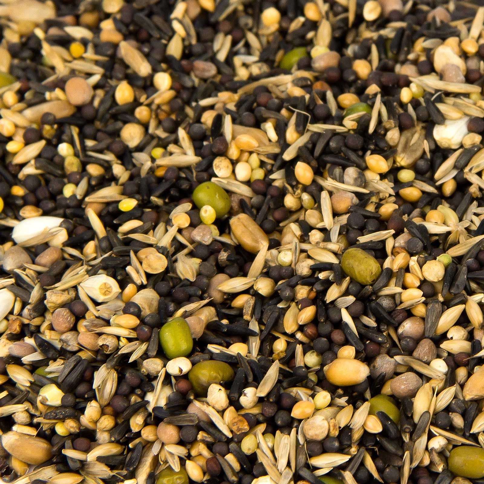 27 % négermag, 20 % tavaszi repce, 2 % fehér salátamag, 4 % fűmag, 10 % sárga köles, 5 % búza, 5 % mungóbab, 6 % spenótmag, 7 % retekmag, 5 % cikóriamag, 3 % kardvirágmag, 6 % fényes mag