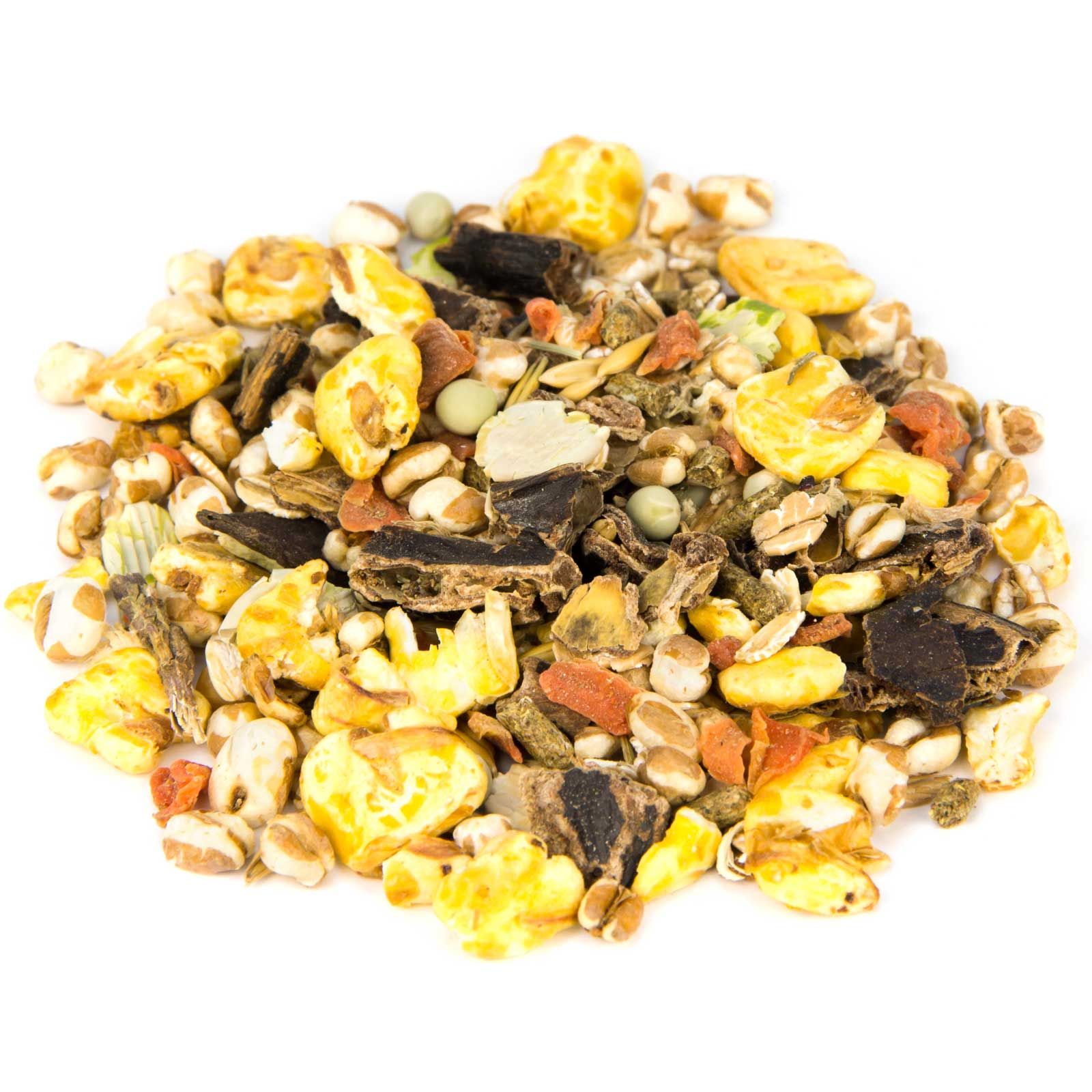 Szeletelt szentjánoskenyér , pattogatott kukorica, kis zöldborsó, kis kukorica, pattogatott búza, zab, kockára vágott sárgarépa, borsópehely, búzapehely, zabpehely, durva búzakorpa, zöldliszt, búza, kukoricakoncentrátum, almatörköly, ánizsmag, szárított pép, mályvacukor gyökér, Édesgyökér, kakukkfű, kankalinlevél, cickafarkfű, szederlevél, repcemagliszt pálcikával, tökmagpogácsa, hibiszkuszvágás, melasz, lignocellulóz, kalcium-karbonát, monokalcium-foszfát, nátrium-klorid, nátrium-bikarbonát, magnézium-oxid.