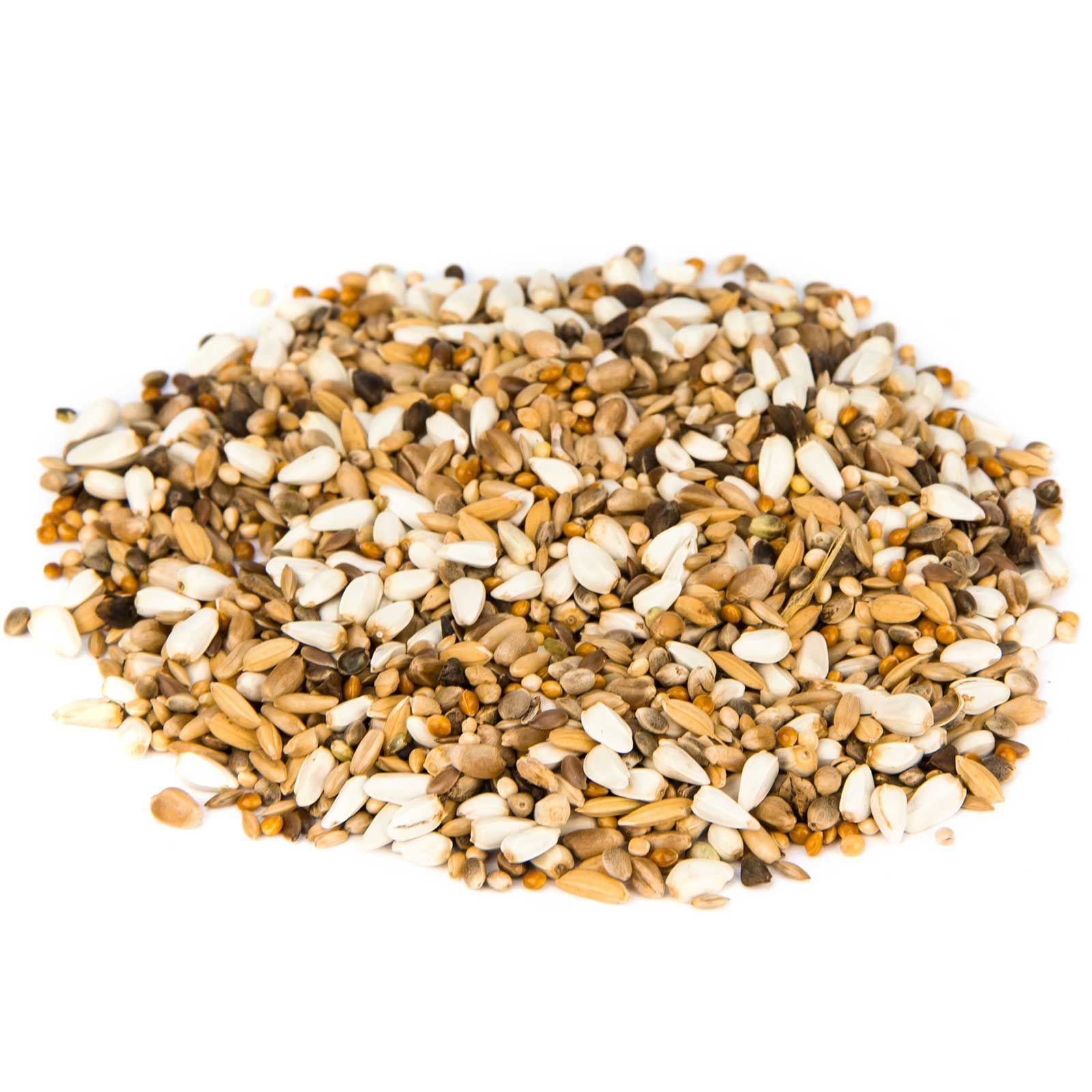 10 % sárga köles, 8 % fényes köles, 8 % vörös köles, 5 % zab, 30 % kardiómag, 5 % lenmag, 10 % kender, 4 % hajdina, 10 % búza, 10 % hántolatlan rizs