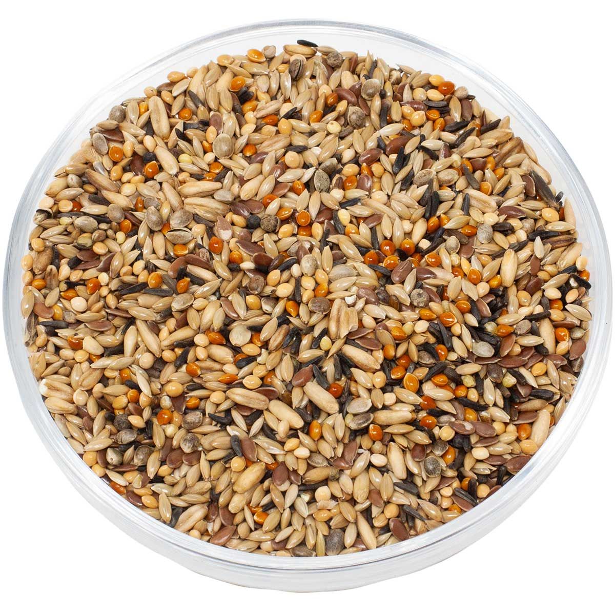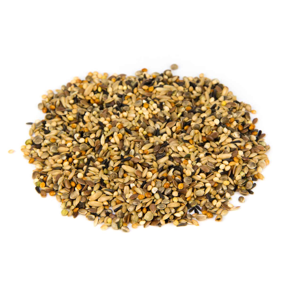 36 % fényes mag, 13 % sárga köles, 13 % kender, 10 % zab, 10 % lenmag, 9 % négermag, 9 % vörös köles