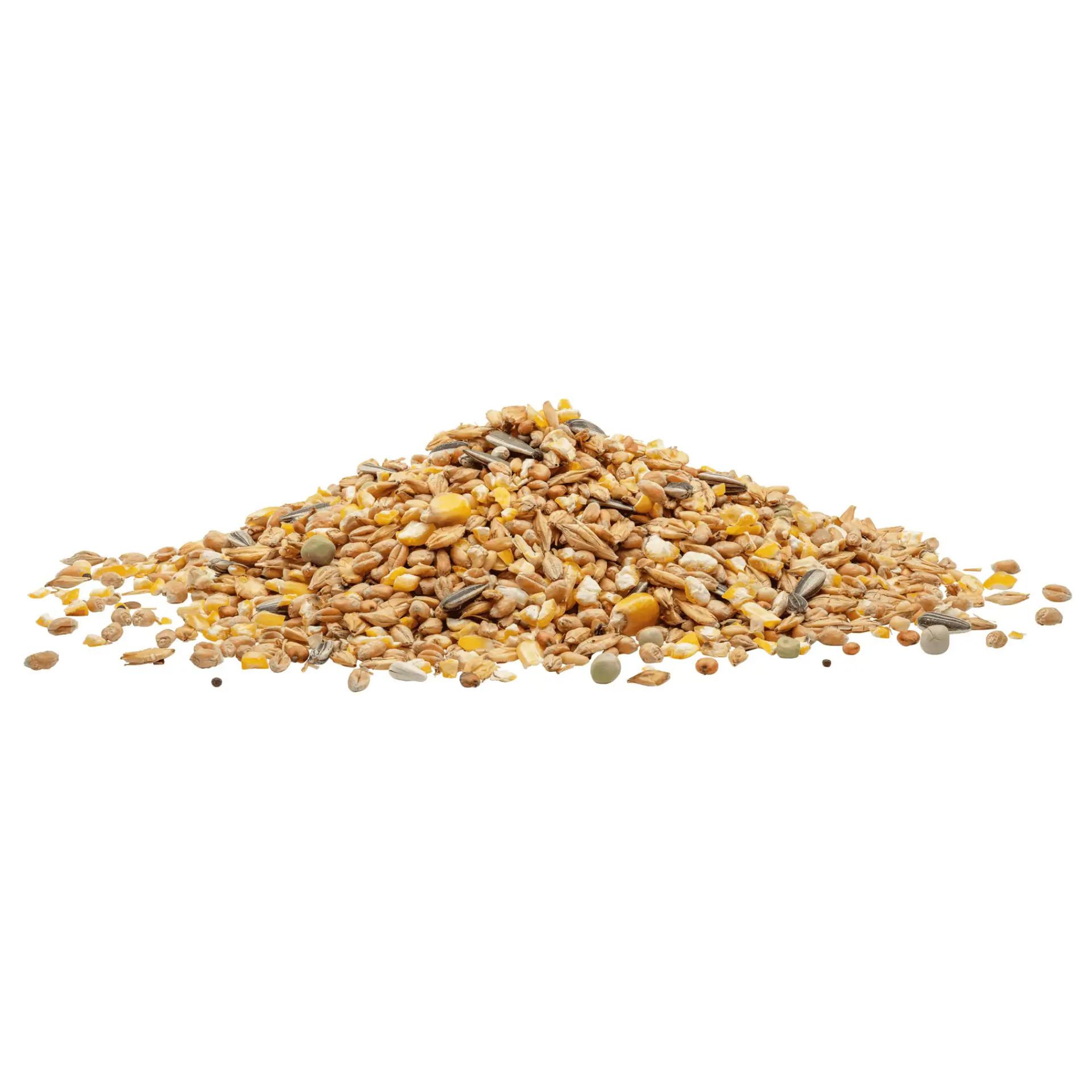 Összetétel: 34,5 % durva durva kukorica, 25,3 % búza, 16,6 % zúzott árpa, 7,0 % sörárpa, 4,6 % csíkos napraforgómag, 4,3 % tejbegríz, 3,0 % zabpehely, 2,1 % kis zöldborsó, 1,3 % dari, 0,7 % kardvirágmag, 0,4 % fekete répa, 0,2 % lenmag.